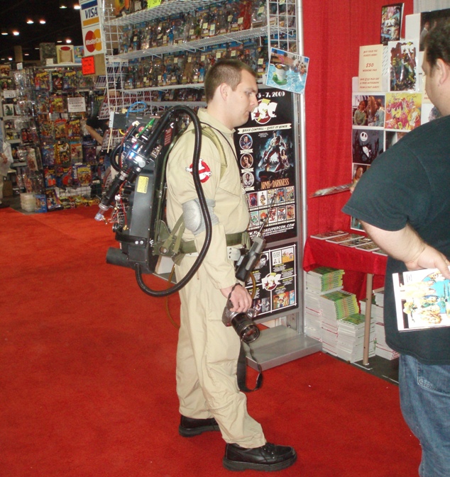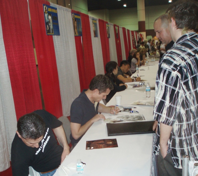 The real draw of the convention seems to be the celebrities, ranging from big screen and television performers to comic book creators. The big names command the big attention, and apparently the big bucks as well. Note to any aspiring actor out there: get thee to a sci-fi show as fast as humanly possible. The crowds at FX overwhelmingly favored cult names such as Julie Benz, James Kyson Lee, and Juliet Landau, not to mention lengthy lines to meet the “Firefly” ladies, Morena Baccarin and Jewel Staite. And by long lines, I mean a train of eager, bearded men waiting for their chance to breathe bad breath on their masturbation fantas…favorite actors. The major player in this genre of autograph awareness was James Marsters, who came to fame on “Buffy the Vampire Slayer” and was recently “seen” in the flop “Dragonball Evolution.” Mr. Marsters is apparently made up of 10% hair gel and 90% gall, requesting his faithful fans cough up $40 for an autograph (an extra $5 for the glossy).