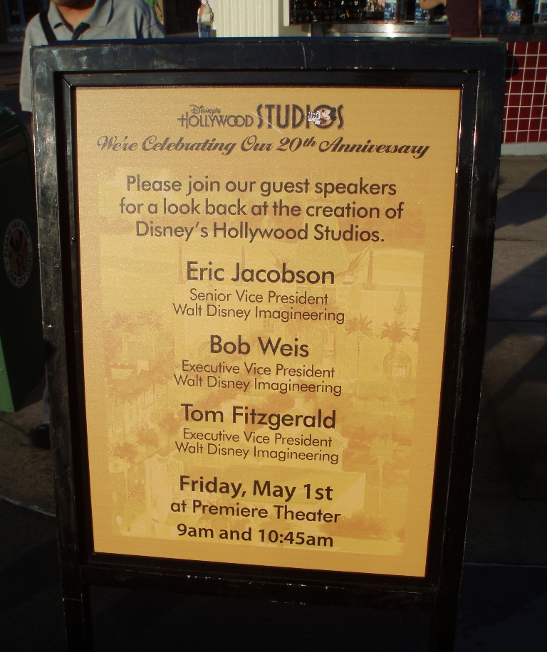 The highlight of the day was the opportunity to sit and watch three Imagineers (Eric Jacobson, Bob Weiss, and Tom Fitzgerald) regale the crowd gathered inside the Premiere Theater with stories covering the creation and backstage history of DHS. It was more of a PowerPoint presentation, but the audience didn’t seem to mind. Actually, they approved in a curious fashion, cooing over the more nostalgic peeks at year one of DHS. The opening picture of the lecture was a standard-issue magic hour shot of the iconic Mickey-eared water tower, and a few in the audience uttered a whimpering “awwwwww,” as though they just witnessed an asthmatic kitten perform a complex math problem.