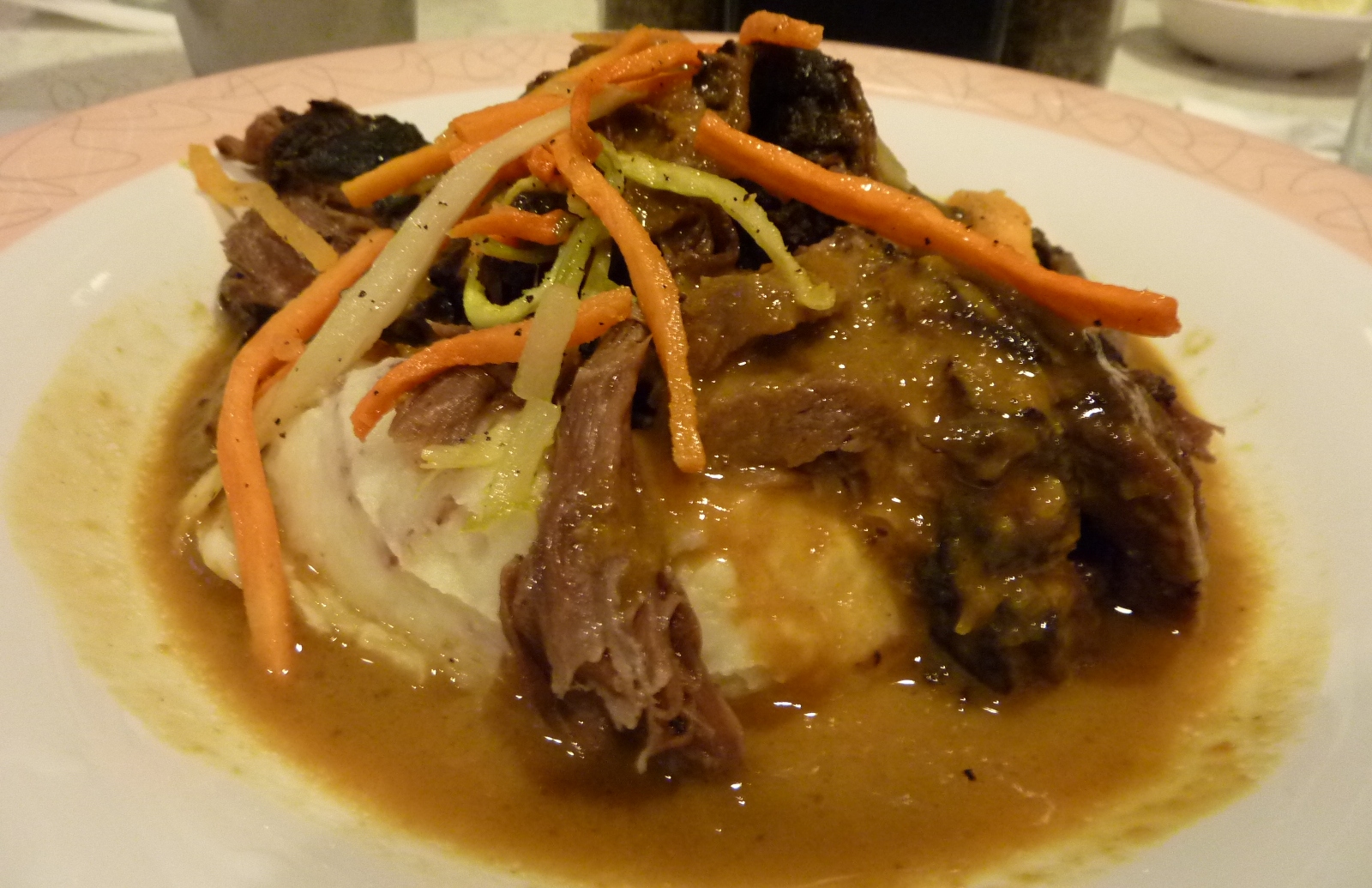 The menu for the Café leans toward comfort food and American cuisine, attempting to offer guests simple sandwiches and entrees to appease the fickle tourist mentality while sneaking in a few items that meld suitably with the theming assault. My dinner companion selected “Cousin Eric’s Char-Grilled Chicken Sandwich,” while I went for “Mom’s Old-Fashioned Pot Roast,” billed here as “fork tender.” It’s a famous dish for the Café, so I figured I would be uncharacteristically adventurous and order a plate to keep the evening on its toes.