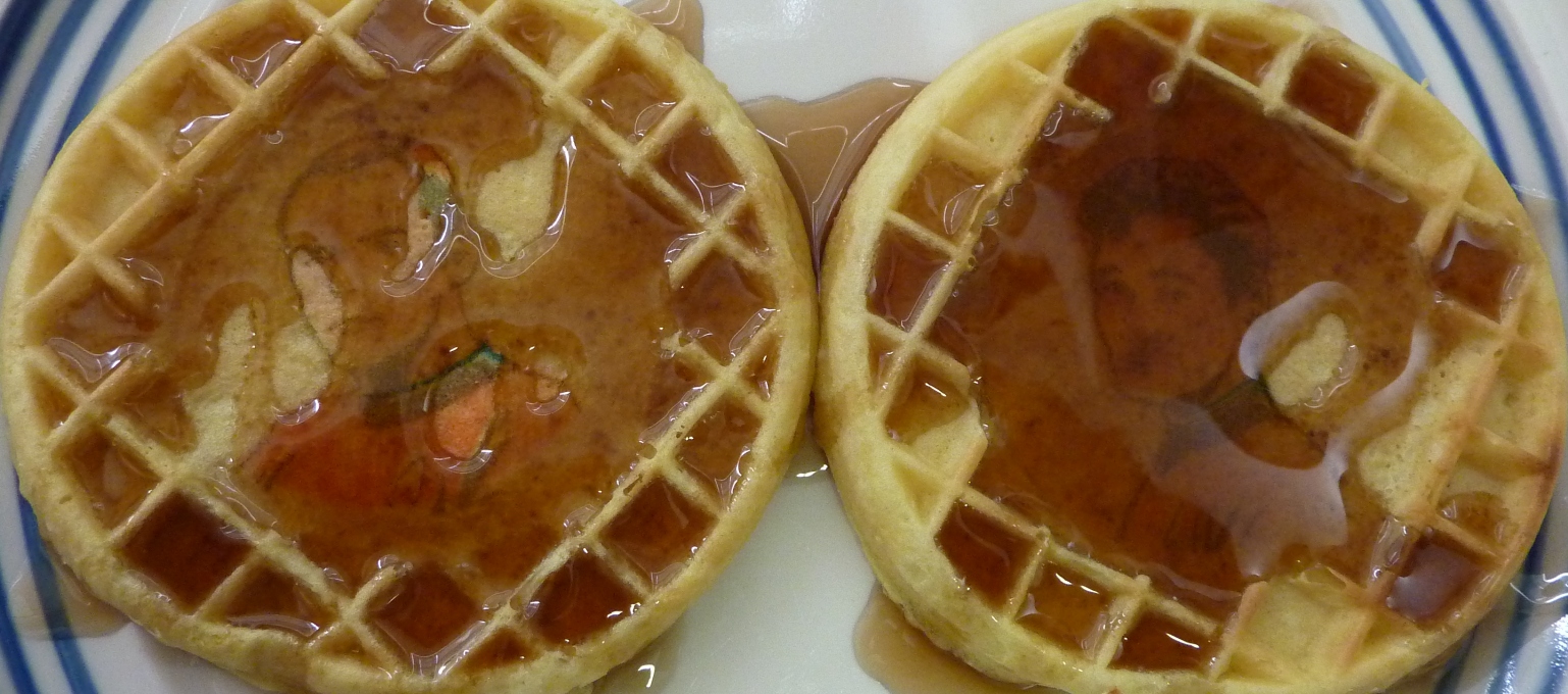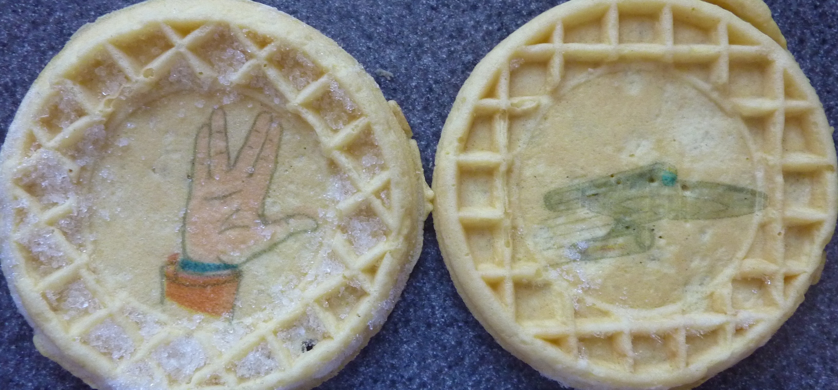 Sadly, outside of a vague scribble of John Cho as Sulu, the package I bought was crammed with lame waffle designs, including a portrait of the U.S.S. Kelvin. You know, the ship that horrifically marches to its doom in the opening ten minutes of the movie? Yeah, you try to pour syrup over that without breaking into tears. Nothing aids digestion quite like recalling the most emotionally shattering moment of the 2009 film year.