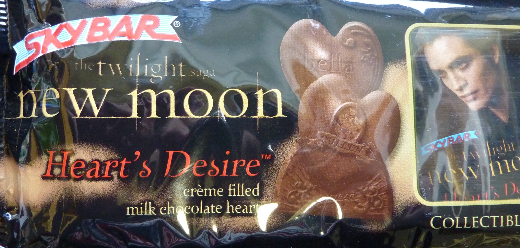 To commemorate the release of “New Moon,” the candy that isn’t dandy, Sky Bar, has stepped up to the plate and halfheartedly constructed a sugared ode to the saga of Bella, that glowy vampire guy, and the gym rat wolfman dude. Branded “Heart’s Desire,” these chocolate bars are basic in construction, hilariously perplexing in design, and filled with a runny vanilla crème that should really be frighteningly symbolic of the sexual urgency of the characters, but I doubt Sky Bar is thinking that clearly. Instead, they should be accepted as candy for the masses, gobbled down by itchy “Twilight” fans desperate to hold anything pertaining to this franchise near. Edward melts in your mouth and your hand, as commanded by the largely pre-menstrual fanbase.