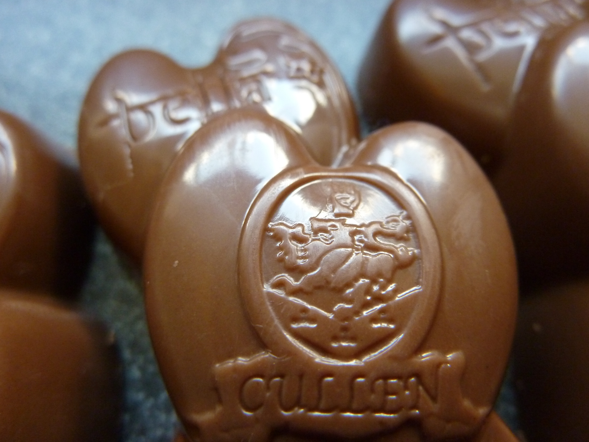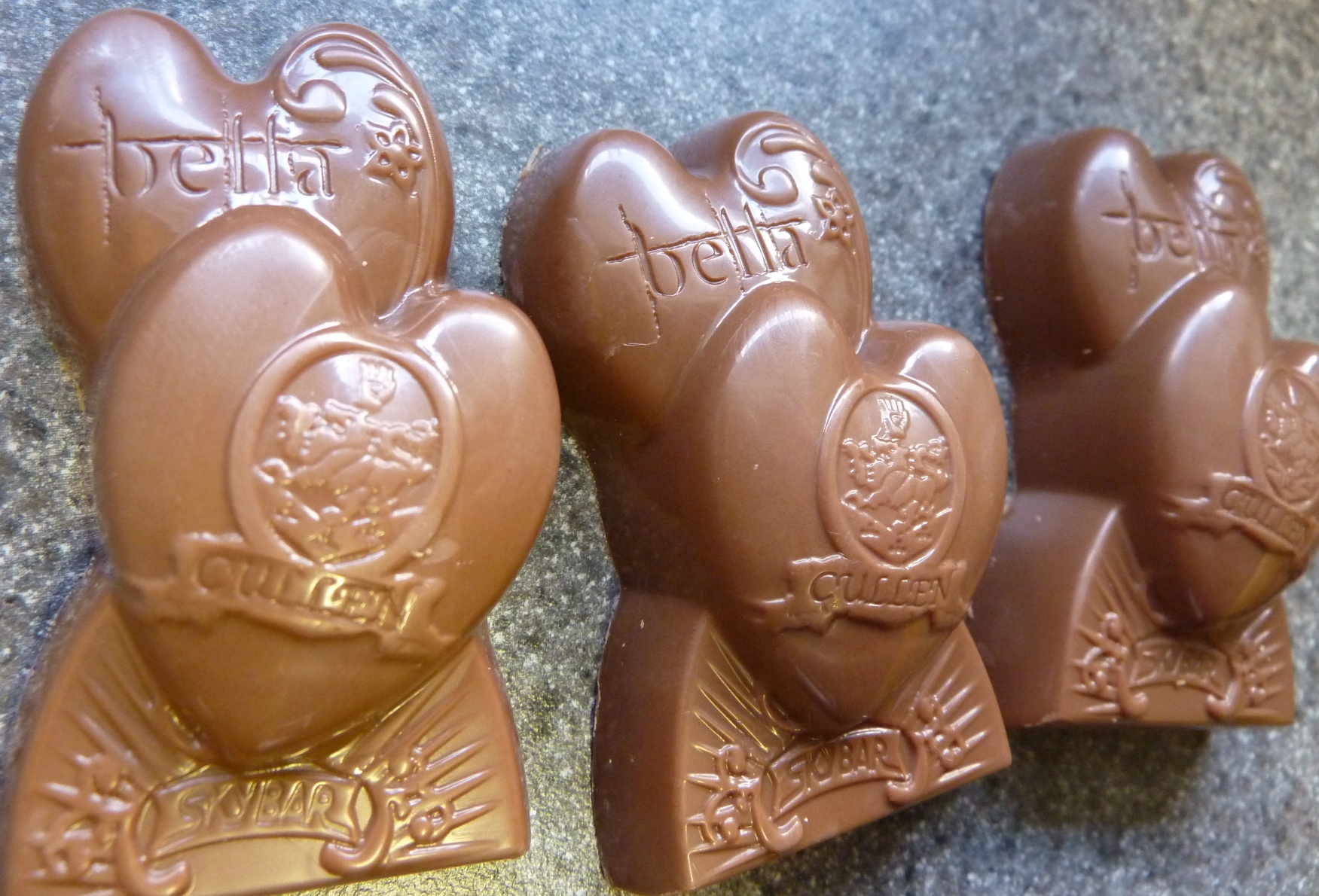 Sold in a sleeve of six bars, the packaging boasts your choice of Bella, Jacob, and Edward. While the visage of each character is printed on the wrapping, the chocolate bar doesn’t offer faces to gleefully crunch. Instead, there’s a surreal bit of design that combines two hearts, one for Bella and one for Edward, only the clarity of the match is a little on a fuzzy side. I get the Bella branding, if only because her name is plainly printed on the candy bar. But Edward is saddled with a family crest? No hair mousse, diamond skin, or baseballs? Sky Bar swings and misses big time here. It’s bad enough to not find a chocolate face waiting for you when unwrapping these suckers, but to present a candy design along the lines of a crappy tattoo? Boring. Even worse, it’s the only design available. The wrappers might incite swoony motions of character preference, but underneath all the fuss is a single portrait of obscure devotion. With a Sky Bar plug as the base.