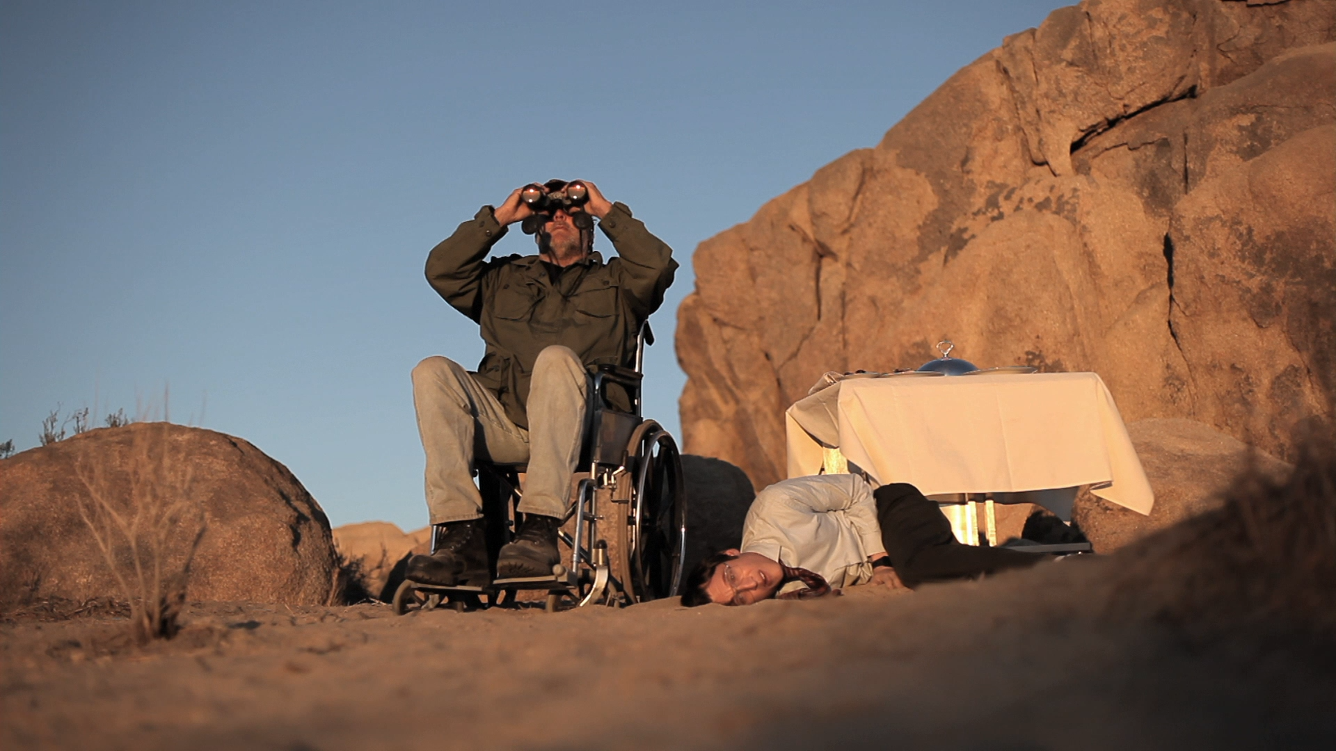 In making a rolling tire the main character, Dupieux assumes a tremendous technical challenge, using clever visual effects to keep the killer on the move for extended tracking shots. The tire breathes when asleep and quakes when angry, summoning its power to pick off roadside animals at first, moving on to humans (head explosions are numerous here) who stand in its way. The tire enjoys hotel rooms and television, takes showers after a long day of dusty rolling, and carries on with human qualities to create a nutzoid submission of Lynchian abstraction and road movie serenity, shot with beautiful desert splendor by the filmmaker.